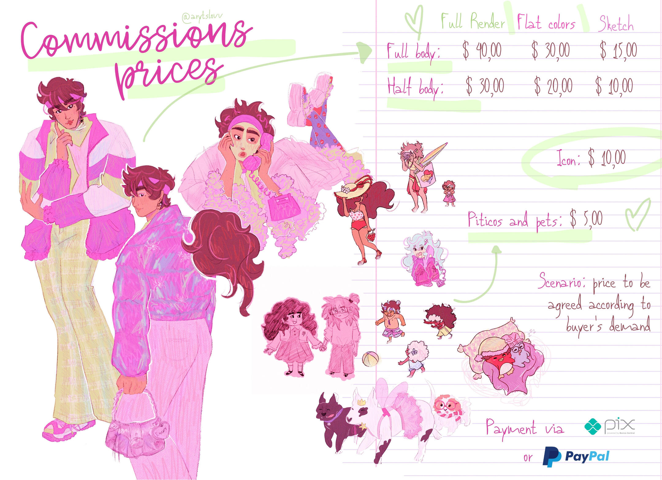 ♡ Após você entregar a descrição e referências, a ideia será analisada e enviarei o valor (que pode ser negociável) e o tempo estimado para eu terminá-la. Caso você tenha uma data específica que a ilustração precisa estar pronta, como datas de aniversários ou dias especiais, me avise previamente para eu verificar se conseguirei entregá-la a tempo.♡ A tabela de preços é uma referência que você usará para ter em mente o valor da minha arte, porém o preço pode variar para mais ou menos dependendo da complexidade do desenho encomendado. Não se preocupe, porque o valor será conversado!♡ COMBOS DE DESCONTO: Dois personagens, o segundo ganha 25% de desconto. Um personagem e um pet, o pet ganha 25% de desconto. (Essa promoção não vale para o estilo Pitico!!!)